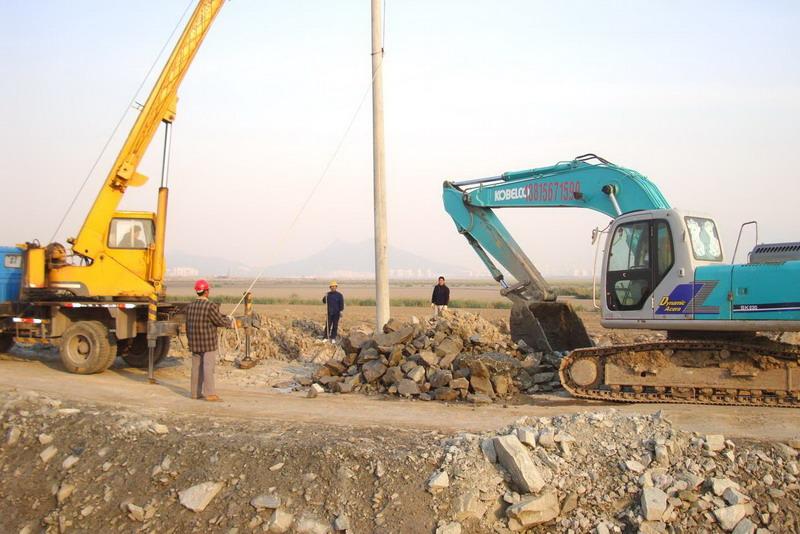 日前,臺北供電所承接的中交一航二公司向海灘延伸供電線路工程開工建設。中交一航二公司擔負著新港城圍海造地的重任,需要架設3公里10千伏高壓線路和變壓器等保障施工用電。圖為供電所工人正在架設電桿。(李吉成)