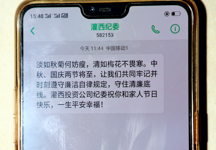 群發(fā)一條廉政提醒短信。以“灌西紀(jì)委”名義向全公司黨員干部普發(fā)“廉政短信”。向黨員領(lǐng)導(dǎo)發(fā)送廉政短信‘拉袖子 、敲警鐘’,以提醒黨員干部“嚴(yán)格執(zhí)行廉潔從政各項規(guī)定,‘反四風(fēng)’、樹新風(fēng),廉潔文明過佳節(jié)”,不僅提醒黨員干部做好廉潔帶頭人,更重要的是提醒廣大領(lǐng)導(dǎo)干部要牢記黨風(fēng)廉政建設(shè)兩個責(zé)任,在落實責(zé)任上要有主動擔(dān)當(dāng)!