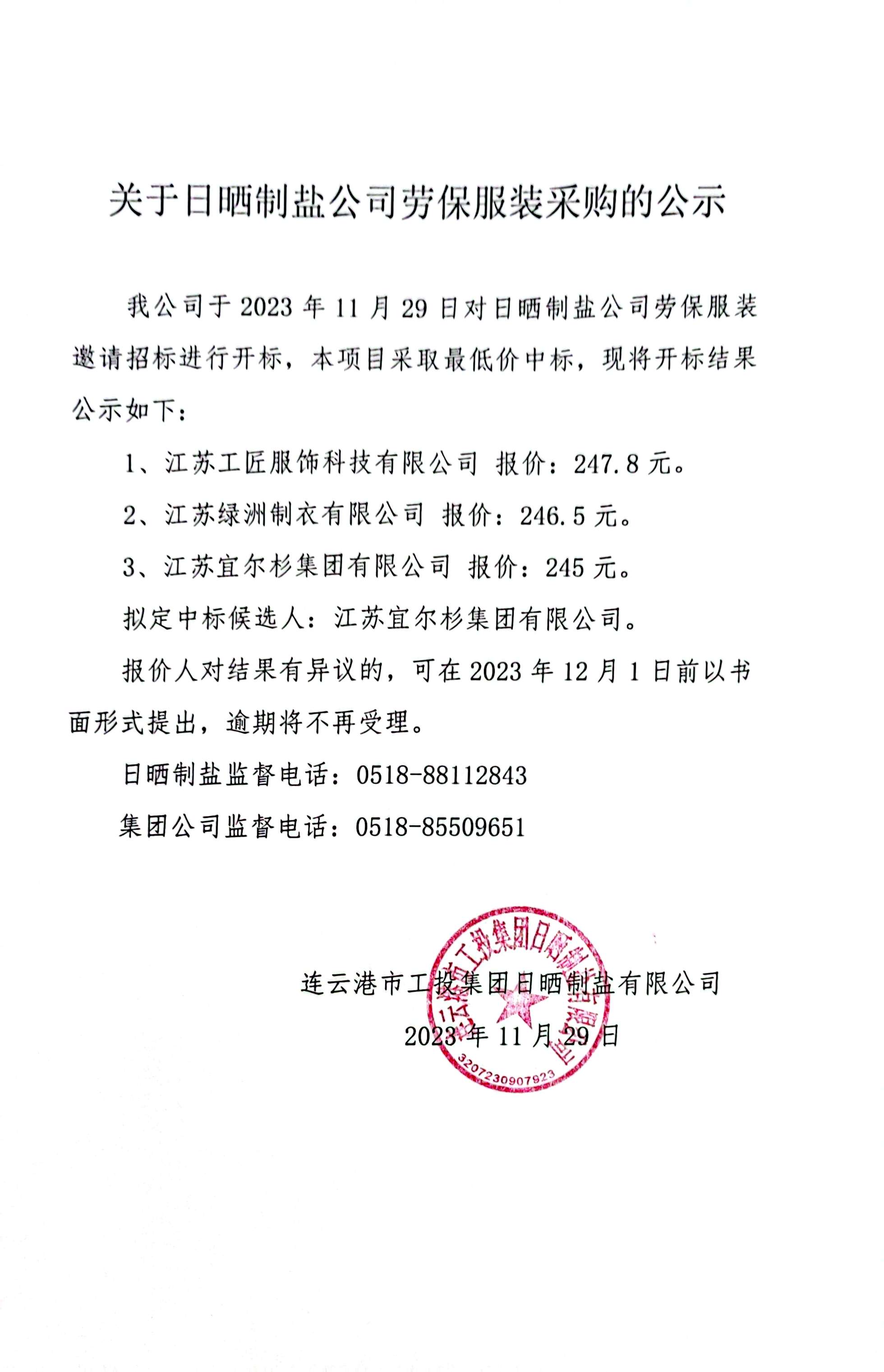 關于日曬制鹽公司勞保服裝采購的公示