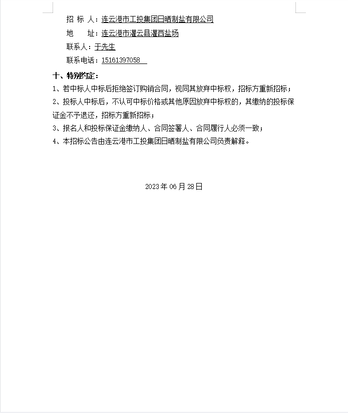 連云港市工投集團日曬制鹽有限公司漏電斷路器等物資招標公告