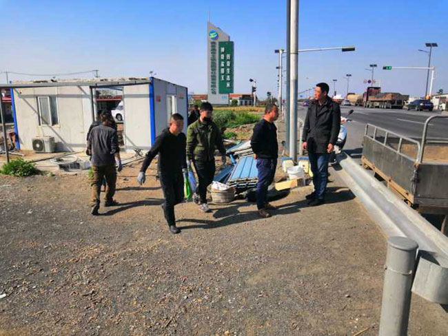 公司領導態度明確,一抓到底全面整治交通環境。摸清形勢,多次召開整治工作專項會議,安排部署整治行動 , 公司領導放棄節假日,現場辦公。三洋、黃沙、大新作為主要牽頭單位,主動扛起責任,挑起擔子,從泰祥公司抽調人力,大家齊心協力。按照時間節點,倒排工期,掛圖作戰,針對現場工作內容,制定 “三步工作法”。一是深入塘頭養殖戶面對面交流,講明利害關系,做通群眾思想工作,確保整治行動順利進行;二 是 制定好拆除先后順序,調配需要的挖掘機、運輸車輛等硬件設施,確保拆遷過程快速有力;三 是 對于已拆除的看護房,及時清理房屋碎石塊,筑牢地基,安排重建。