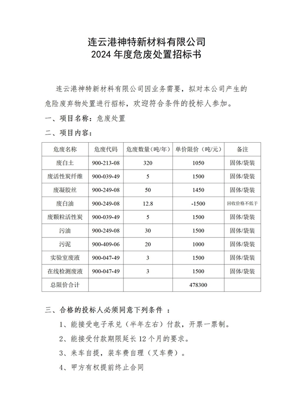 神特公司2024年危廢處置邀請招標公告