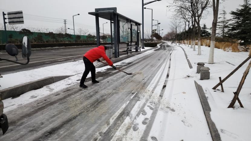 “融雪劑拋灑的時候要均勻拋灑,不要成團堆積,這樣不僅融雪的效果不好,還會浪費物資。”預備黨員武新忠一邊說著,一邊示范著給其他隊員。哪里的積雪最厚,哪里就有他們揮鍬鏟雪的身影。在融雪劑不能及時送達的情況下,他們就使用人工除雪的方式,不斷檔、不離線、不缺位的清除路面積雪,保證路面不出現(xiàn)積雪狀況。為堅決完成上級“雪停路凈”的掃雪除冰任務,他們不畏嚴寒,冒著風雨冰雪,晝夜不停,連續(xù)三天奮戰(zhàn)在掃雪的一線!以雪為令,雪不停,掃雪不止,一直堅守在掃雪工作中,有效清除了區(qū)域內的積雪,確保了交通道路的安全暢行。