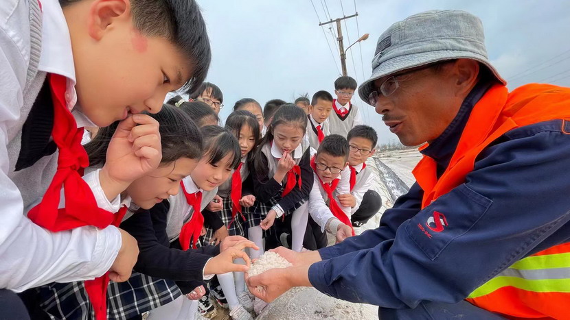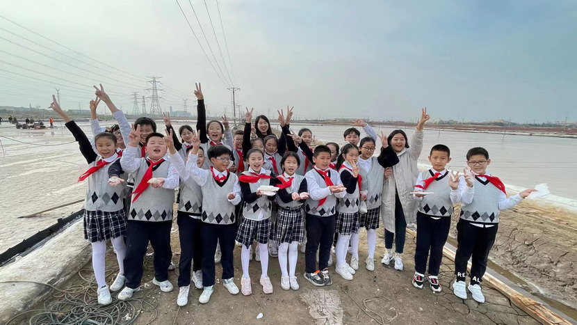 同學們近距離感受淮鹽的生產過程,聽老鹽工講述過去收鹽的故事。為了感受鹽工的辛苦,同學們還興致勃勃地穿上膠鞋,來到鹽池中,用耙子扒鹽,用鏟子將結晶的鹽堆成堆,用手觸摸鹽的質地,觀察鹽的結晶形狀……同學們不禁感慨小小鹽粒的來之不易。
