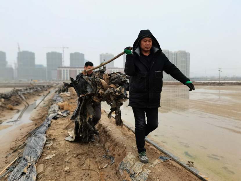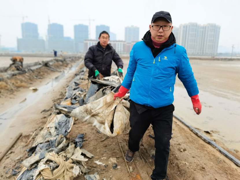 110日下午,第一批馳援隊伍——翔立分公司黨員突擊隊到達先鋒班組,結合海州灣公司黨員突擊隊共30余名隊員,穿戴好工作服、水鞋,兩人一組,三人一隊,雙肩挑,三人抬,緊張有序地清理生產現場拆除下來的廢棄的塑布、鋼絲等雜物。