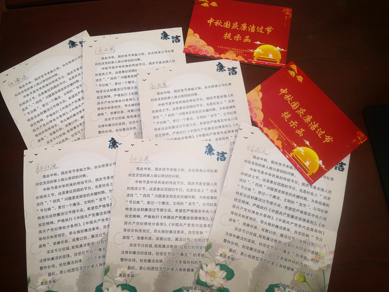 溫馨提示函早提醒。值此中秋、國(guó)慶佳節(jié)來臨之際,臺(tái)北投資公司紀(jì)委向您和您的家人致以親切的問候……時(shí)時(shí)警鐘長(zhǎng)鳴,處處廉潔自律,過一個(gè)幸福祥和的節(jié)日!節(jié)前,公司通過廉潔提示函黨員領(lǐng)導(dǎo)干部贈(zèng)送節(jié)日廉提醒,將廉潔過節(jié)的紀(jì)律要求融入節(jié)日祝福。