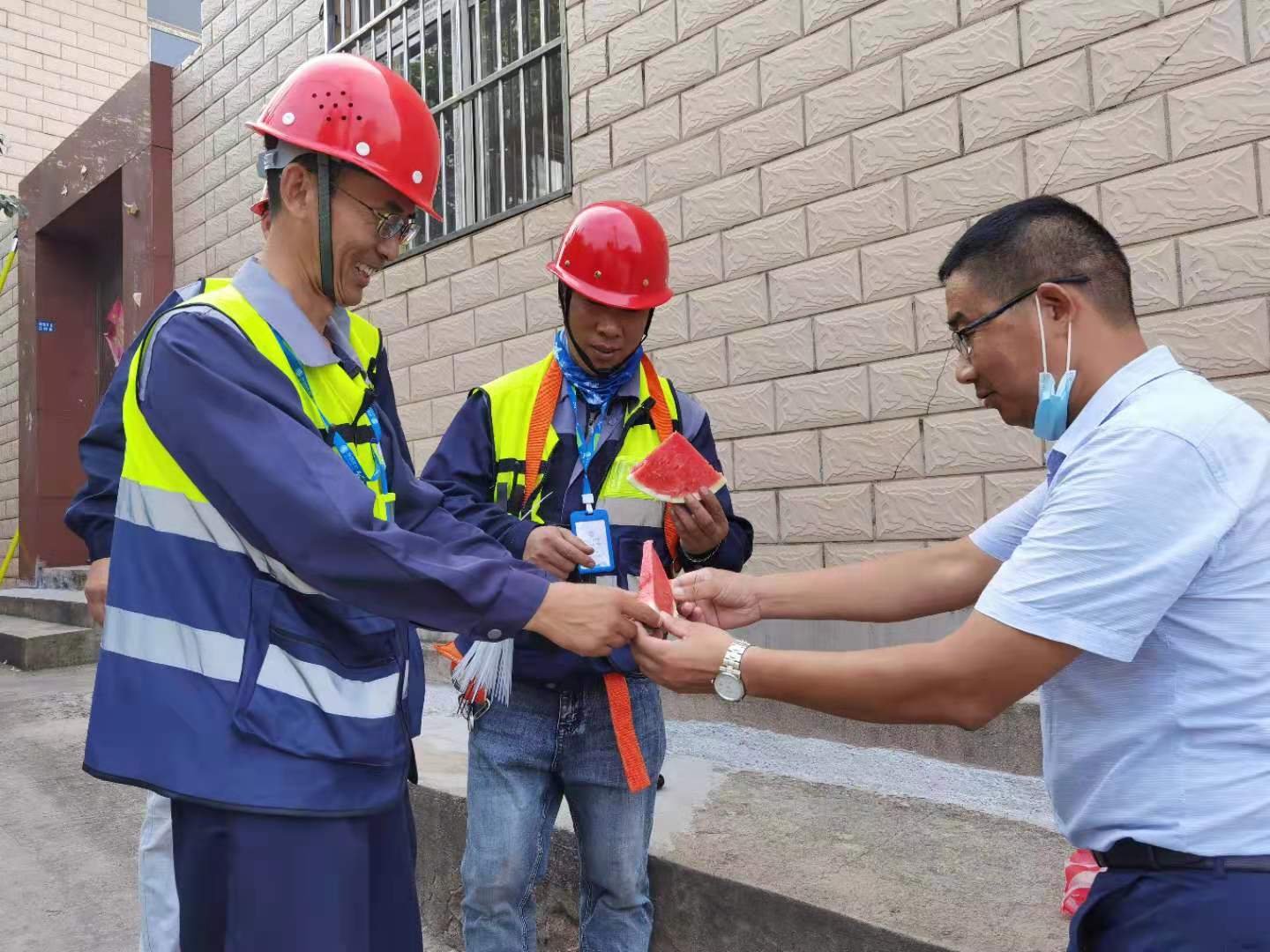 8月19日下午,翔立分公司工會(huì)為奮戰(zhàn)在移動(dòng)線纜整理第一線的職工送去西瓜,為他們帶來組織的關(guān)懷,在炎炎夏日送上絲絲涼意。為完成今年下達(dá)的目標(biāo)經(jīng)營(yíng)任務(wù),通信各小分隊(duì)的成員不懼高溫“烤驗(yàn)”,全力以赴堅(jiān)守在工作第一線。路邊瓜香彌漫,讓這個(gè)夏天不再炎熱。