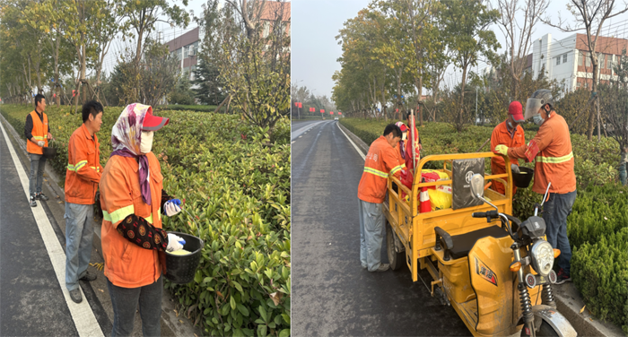 ? ? ? 工作中,班長李洪利、副班長李明春,帶領綠化班組30余人,對云港路、祥和路仁和路,進行施肥作業?!皥@林衛士”手拿施肥工具,2-3人為一小組,采用徒步拋灑方式進行作業,縱三路的側分帶雪松,因長勢不良土壤環境因素,為重點施肥對象。云港路路線較長,采取分段作業,重點突破。經過一天的忙碌,完成既定路段的施肥任務。